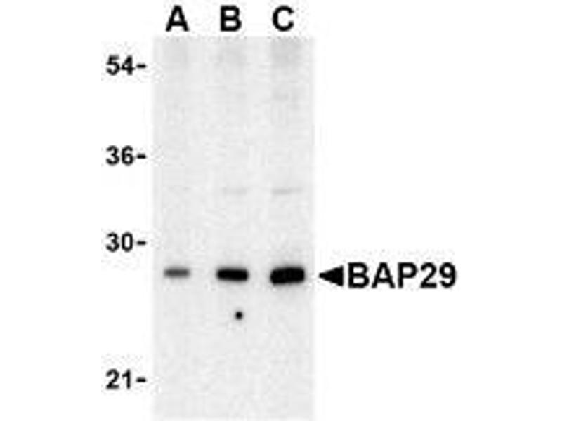 ELISA. Western Blot: Bap29 antibody can be used for the detection of Bap29 at 0.5 - 1 μg/mL. Immunohistochemistry. Other applications not tested. Optimal dilutions are dependent on conditions and should be determined by the user.