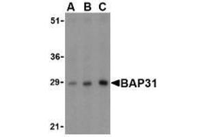ELISA. Western Blot: BAP31 antibody can be used for the detection of BAP31 by Western blot at 0.5- 1 μg/mL. Immunohistochemistry. Other applications not tested. Optimal dilutions are dependent on conditions and should be determined by the user.