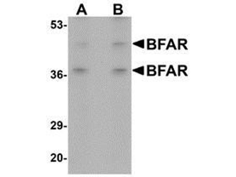 ELISA. Western Blot: BFAR antibody can be used for detection of BFAR at 1 - 2 μg/mL. Immunohistochemistry. Other applications not tested. Optimal dilutions are dependent on conditions and should be determined by the user.