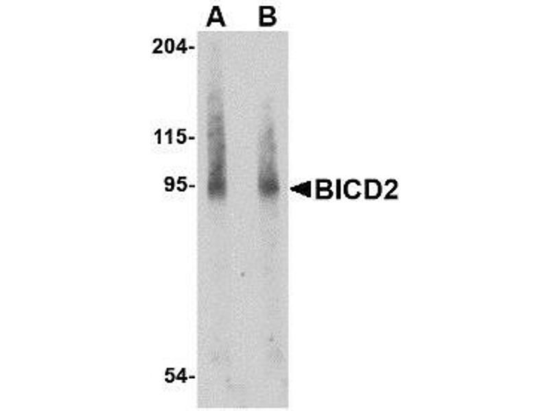 ELISA. Western Blot: BICD2 antibody can be used for detection of BICD2 at 1 - 2 μg/mL. Other applications not tested. Optimal dilutions are dependent on conditions and should be determined by the user.