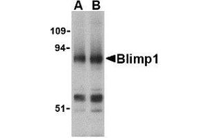 ELISA. Western Blot: Blimp-1 antibody can be used for detection of Blimp-1 by Western blot at 0.5- 1 μg/mL. Immunohistochemistry. Other applications not tested. Optimal dilutions are dependent on conditions and should be determined by the user.