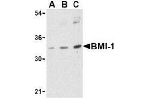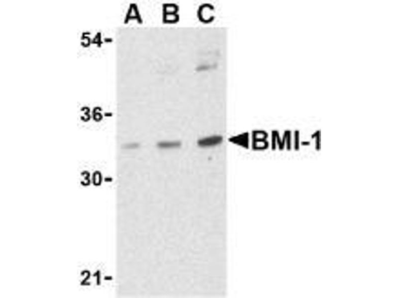 ELISA. Western Blot: BMI-1 antibody can be used for detection of BMI-1 at 0.5 to 1 μg/mL. Immunocytochemistry. Other applications not tested. Optimal dilutions are dependent on conditions and should be determined by the user.