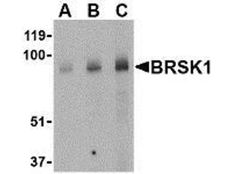 ELISA. Western Blot: BRSK1 antibody can be used for detection of BRSK1 at 0.5 - 1 μg/mL. Immunohistochemistry. Other applications not tested. Optimal dilutions are dependent on conditions and should be determined by the user.