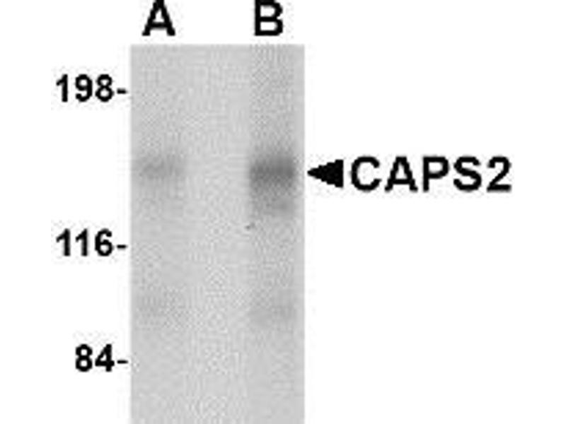 CAPS2 and the related protein CAPS1 encode novel neural/endocrine-specific cytosolic and peripheral membrane proteins. Both are essential components of the synaptic vesicle priming machinery and are required for the Ca2+-regulated exocytosis of secretory vesicles, CAPS-deficient neurons contain no or very few fusion competent synaptic vesicles, causing a selective impairment of fast phasic transmitter release. Like CAPS1, numerous isoforms of CAPS2 are known to exist. These isoforms show distinct expression patterns in the brain. For example, CAPS2b showed high expression in the developing cerebellum. Furthermore, one version of CAPS2 mRNA that lacks exon 3 is detected in some autistic patients, suggesting that the differential expression pattern of CAPS2 is involved in neuronal development. This CAPS2 antibody is predicted to be specific to CAPS2 and not recognize CAPS1.Synonyms: Calcium-dependent activator protein for secretion 2, Calcium-dependent secretion activator 2, KIAA1591