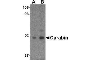 ELISA. Western Blot: Carabin antibody can be used for detection of Carabin at 1 - 2 μg/mL. Immunohistochemistry. Other applications not tested. Optimal dilutions are dependent on conditions and should be determined by the user.