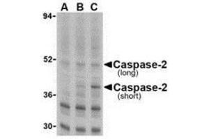 ELISA. Western Blot: Caspase-2 antibody can be used for the detection of caspase-2 at 1 μg/mL. Depending on cell lines or tissues used, other cleavage products may be observed. Immunohistochemistry. Other applications not tested. Optimal dilutions are dependent on conditions and should be determined by the user.