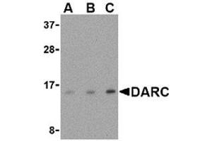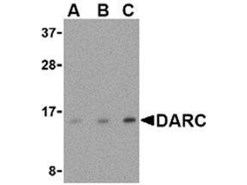 DARC, also known as the Duffy antigen/chemokine receptor, is a seven-transmembrane protein homologous to the classical chemokine G-protein coupled receptors (GPCRs) with the exception of the motif required for G protein coupling. DARC can bind with high affinity several chemokines without transducing any signal, suggesting it may modulate the signals normally induced by these chemokines. Recently, DARC was found to interact with KAI1, a four transmembrane protein recently identified as a tumor metastasis suppressor protein. It is thought that tumor cells dislodged from the primary tumor and expressing KAI1 interact with DARC proteins expressed on vascular cells, transmitting a senescent signal to the tumor cells, while tumor cells that have lost KAI1 expression can proliferate and potentially give rise to metastases. At least three isoforms of DARC are known to exist.Synonyms: Duffy antigen/chemokine receptor, FY, Fy glycoprotein, GPD, Glycoprotein D, GpFy, Plasmodium vivax receptor
