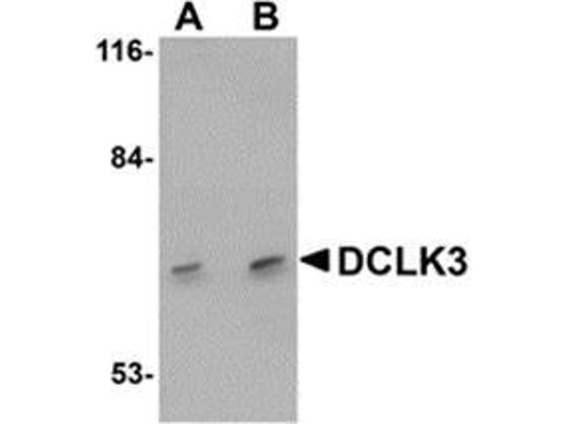 DCLK3 is one of three doublecortin-like kinases similar to the Ca2+/calmodulin-dependent protein kinase (CaMK) family. DCLK3 mRNA, like that of the homologous DCLK1 and DCLK3, is highly expressed in adult brain, but only DCLK3 transcripts are present in liver and kidney, suggesting that DCLK3 may play other roles than in cortical development. The DCLK proteins are homologous to Doublecortin (DCX), a protein that is mutated in X-linked human lissencephaly. In mouse models where the DCX gene has been disrupted, DCLK1 expression increases slightly and appears to compensate for the loss of DCX, as mice mutant for both DCX and DCLK1 show a severe phenotype including perinatal lethality, disorganized neocortical layering, and profound hippocampal cytoarchitectural disorganization.Synonyms: DCAMKL3, DCDC3C, DCK3, DCLK3, KIAA1765, Serine/threonine-protein kinase DCLK3