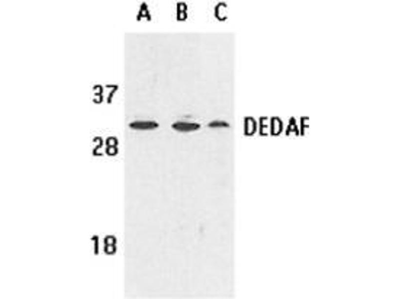 - DEDAF antibody was raised against a synthetic peptide corresponding to amino acids 215 to 228 of human DEDAF. The sequence is identical to that of mouse origin.