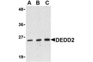 Apoptotic signals are often triggered by cell surface death receptors through protein-protein interactions mediated by conserved domains such as the death effector domain (1). A novel death effector domain (DED)-containing protein, DEDD2, has been recently identified and its over-expression in transfected cells induces moderate apoptosis and results in substantial sensitization to apoptosis induced by Fas, TRAIL, and FADD (2). More recently, work has shown that DEDD2 can bind caspase-8 and -10 in addition to FLIP but not FADD (2,3). Like the related protein DEDD, DEDD2 translocates from the cytosol to the nucleus upon induction of apoptosis, and it has been suggested that DEDD2 may target caspase-8 to the nucleus and that DEDD2 thus plays a critical role in death receptor-induced apoptosis (3). At least two alternatively spliced transcript variants encoding distinct isoforms have been found for DEDD2.Synonyms: DED-containing protein FLAME-3, DEDD-2, DNA-binding death effector domain-containing protein 2, FADD-like anti-apoptotic molecule 3, FLAME-3, FLAME3, PSEC0004