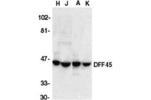 ELISA. Western Blot: DFF45 antibody can be used for detection of DFF45 and one of the cleavedfragments of DFF45 at 1/1000 to 1/2000 dilution. A 45 kDa band can be detected innon-apoptotic cells. Immunocytochemistry. Immunoprecipitation: DFF45 antibody can be used for detection of DFF45 and one of thecleaved fragments of DFF45 at 1/1000 to 1/2000 dilution.