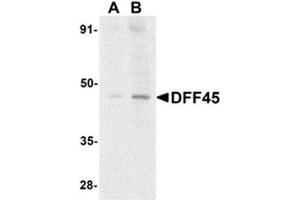 ELISA. Western Blot: DFF45 antibody can be used for detection of DFF45, DFF35, and one thecleaved fragment at 1/1000 to 1/2000 dilution.45 and 35 kDa bands can be detected innon-apoptotic cells. Other applications not tested. Optimal dilutions are dependent on conditions and should be determined by the user.
