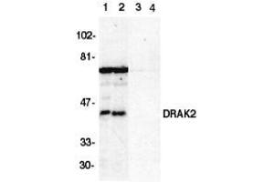 Apoptosis is mediated by death domain containing adapter molecules and a caspase family of proteases. Certain serine/threonine protein kinases, such as ASK-1 and RIP, are mediators of apoptosis. Two novel serine/threonine kinases that induce apoptosis were recently identified and designated DRAK1 and DRAK2 (for DAP kinase-related apoptosis-inducing protein kinases) (1). DRAKs contain an N-terminal kinase domain and a C-terminal regulation domain. Overexpression of DRAK2 induces apoptosis. DRAKs have high sequence homology to DAP and ZIP kinases, and they represent a novel family of serine/threonine kinases, which mediates apoptosis through their catalytic activities. DRAK2 is located in nucleus and the messenger RNA was ubiquitously expressed in human tissues (1).Synonyms: DAP kinase-related apoptosis-inducing protein kinase 2, Serine/threonine-protein kinase 17B