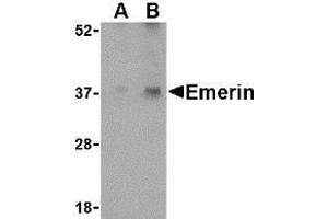 Emerin is a serine-rich nuclear membrane protein and a member of the nuclear lamina-associated protein family that includes proteins such as LAP2 and MAN1. Each family member, including Emerin, has an ~40 amino acid LEM-domains that binds barrier-to-autointegration (BANF1), a conserved chromatin protein that also serves as a host cell component of retroviral integration complexes, including that of HIV. Emerin is anchored at the inner membrane of the nuclear envelope where it binds to nuclear intermediate filaments that are formed by lamin proteins. Dreifuss-Emery muscular dystrophy is an X-linked inherited degenerative myopathy resulting from mutation in the emerin gene.Synonyms: EDMD, EMD, STA