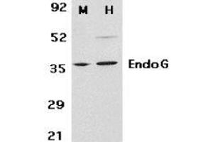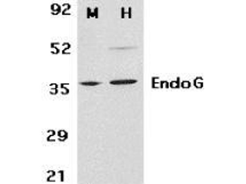 - EndoG antibody was raised with a synthetic peptide corresponding to 15 amino acids near the amino terminus of human EndoG.