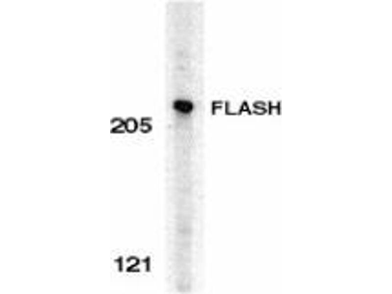 FLASH antibody was raised against a synthetic peptide corresponding to amino acids near the carboxy-terminus of human FLASH which differ from those of mouse by one amino acid.