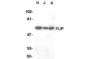 FLIP antibody was raised against a peptide corresponding to amino acids near the C-terminus of human FLIPaFLIPl form. Antibody recognizes the FLIPa only.