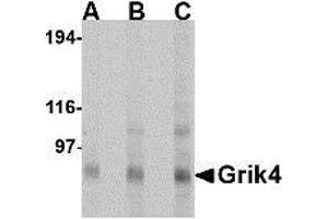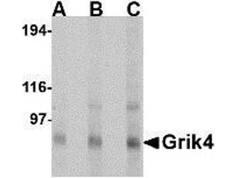 Grik4 codes for the KA1 subunit of kainate-type ionotropic glutamate receptors which are critical regulators of network activity that act by modifying neuronal excitability, directly and indirectly, through GABAergic interneurons. Five subunits can assemble to form kainate receptors (KARs): GluR5 (coded by Grik1), GluR6 (coded by Grik2), and GluR7 (coded by Grik3) are the low-affinity subunits, and KA1 and KA2 are the high-affinity subunits. In the adult brain, KARs are located pre- and postsynaptically on pyramidal cells and on interneurons. Kainate receptors on GABA-containing interneurons enhance GABA release and thereby downregulate glutamatergic signaling. KARs have been implicated in numerous psychiatric disorders. Case control studies show significant association of Grik4 with both schizophrenia and bipolar disorder. Despite its predicted molecular weight, Grik4 often migrates at a lower molecular weight in SDS-PAGE.Synonyms: EAA1, Excitatory amino acid receptor 1, Glutamate receptor ionotropic kainate 4