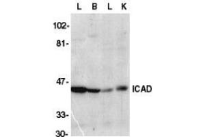 Apoptosis is related to many diseases and induced by a family of cell death receptors and their ligands. Cell death signals are transduced by death domain containing adapter molecules and members of the caspase family of proteases. These death signals finally cause the degradation of chromosomal DNA by activated DNase. A human DNA fragmentation factor (DFF) was identified recently which was cleaved by caspase-3 during apoptosis. Mouse homologue of human DFF was identified as a DNase inhibitor designated ICAD, for inhibitor of caspase-activated DNase. Upon cleavage of DFF/ICAD, a caspase activated deoxyribonuclease (CAD) is released and activated and eventually causes the degradation of DNA in the nuclei. Therefore, the cleavage of CAD inhibitor molecule DFF/ICAD, which causes DNase activation and DNA degradation, is the hallmark of apoptotic cell death.Synonyms: DFF-45, DFF1, DFF45, DNA fragmentation factor 45 kDa subunit, DNA fragmentation factor subunit alpha, Inhibitor of CAD