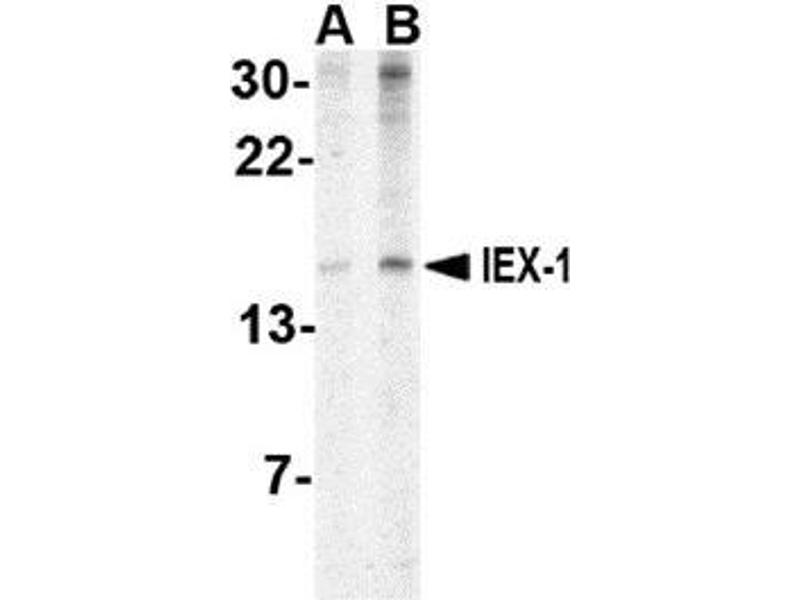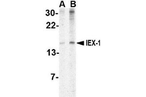 IEX-1 is a stress inducible gene that is induced by ionizing radiation, ultraviolet radiation, and a variety of growth factors, i.e., FAS and TNF-a. IEX-1 is widely expressed in epithelial and endocrine tissues, as well as in vascular endothelium. It plays an important role in the regulation of cellular growth, cell death and oncogenesis. IEX-1 is precisely regulated by multiple transcription factors such as p53, NF-kappaB/rel, Sp1 and c-Myc, to ensure rapid and transient expression of IEX-1 in cells under a variety of stress conditions. IEX-1 is expressed as both a longer form (IEX1L) and a splice variant, designated IEX1S. It is localized to the nucleus and perinuclear region. Overexpression of IEX-1 facilitates apoptosis and cell cycle progression, whereas disruption of IEX-1 expression is associated with decreases in both apoptosis and cell cycle progression.Synonyms: DIF2, Differentiation-dependent gene 2 protein, GLY96, IEX-1, Immediate early protein GLY96, Immediate early response 3 protein, PACAP-responsive gene 1 protein, PRG1, Radiation-inducible immediate-early gene IEX-1