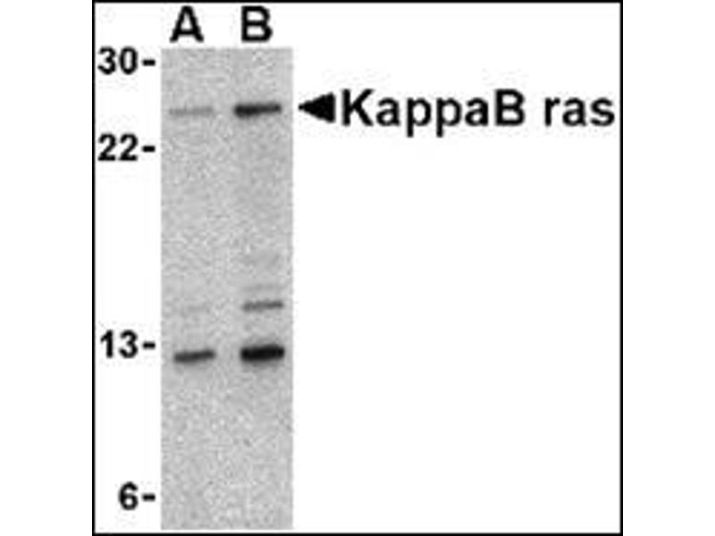 - KappaB ras antibody was raised against a 18 amino acid peptide from near the center of human KappaB ras 1.