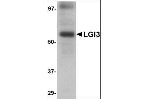 This antibody detects LGI3 at center. It will recognize both isoforms. The antibody is predicted to be specific to LGI3 and not recognize other LGI proteins. The observed higher molecular weight band may represent a post-translationally modified form of LGI3.
