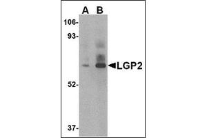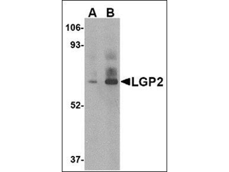 Anti-viral innate immune responses are triggered by pathogen-associated molecular patters (such as the accumulation of intracellular nucleic acids resulting from virus infections) and represent the first line of defense against numerous infectious organisms. The Toll-like receptors (TLR) 3, 7, 8, and 9 are expressed in immune cells and function as transmembrane pattern recognition receptors to detect foreign nucleic acids. Other proteins that play similar roles, such as RIG-1 and MDA5 are members of a CARD-helicase family and are expressed in the cytoplasm. A third protein, LGP2, is similar to RIG-1 and MDA5, except for lacking a homologous CARD domain. It is thought to act as an element of negative-feedback regulation of intracellular antiviral signaling. At least four isoforms of LGP2 are known to exist.Synonyms: ATP-dependent RNA helicase DHX58, ATP-dependent helicase LGP2, D11LGP2E, DHX58, LGP2, Protein D11Lgp2 homolog