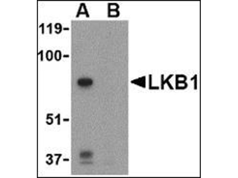 The LKB1 serine/threonine protein kinase was initially identified as a tumor suppressor gene mutated in human Peutz-Jeghers syndrome (PJS), a condition resulting in the growth of numerous intestinal polyps classed as hamartomas. LKB1 exists as a heterotrimeric complex with two other proteins, Ste20-related adaptor protein (STRAD) and MO25. Together, this complex can phsophorylate and activate the AMP-activate protein kinase (AMPK). Following AMPK activation by LKB1, AMPK then phosphorylates TSC1 and TSC2, key components of the metabolism-regulating TOR signaling pathway, which antagonizes the activation for the TOR pathway. LKB1 has also been shown to play a fundamental role in controlling the spatial orientation of structures required to maintain an ordered, polarized epithelium. LKB1 often migrates at a higher than expected molecular weight in SDS-PAGE.Synonyms: LKB1, NY-REN-19, PJS, Renal carcinoma antigen NY-REN-19, Serine/threonine-protein kinase 11, Serine/threonine-protein kinase LKB1