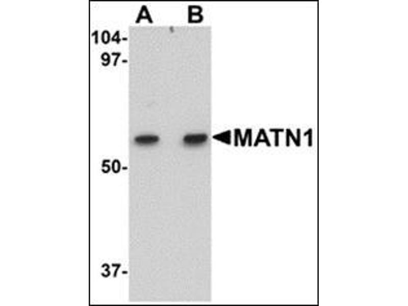 Matrilins (MATNs) are a family of non-collagenous extra-cellular matrix (ECM) proteins consisting of four known members that have been proposed to play key roles in modulating cellular phenotypes during chondrogenesis of mesenchymal stem cells (MSCs). MATN1 and MATN3 are expressed specifically in cartilage and are among the most up-regulated ECM proteins during chondrogenesis. MATN1 is composed of two Willebrand Factor A (vWFA) domains separated by one EGF-like domain, whereas MATN3 is composed of a single N-terminal vWFA domain followed by four epidermal growth factor (EGF) repeats and a coiled-coil domain. MATN1 or MATN3 may play a role in modulating chondrogenesis during the chondrocyte differentiation process. Mutations of this gene have been associated with variety of inherited chondrodysplasias. Recent studies show that the MATN1 promoter region was associated with both susceptibility and disease progression in Adolescent idiopathic scoliosis.Synonyms: CMP, CRTM, Cartilage matrix protein, MATN1