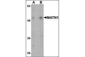 Matrilins (MATNs) are a family of non-collagenous extra-cellular matrix (ECM) proteins consisting of four known members that have been proposed to play key roles in modulating cellular phenotypes during chondrogenesis of mesenchymal stem cells (MSCs). MATN1 and MATN3 are expressed specifically in cartilage and are among the most up-regulated ECM proteins during chondrogenesis. MATN1 is composed of two Willebrand Factor A (vWFA) domains separated by one EGF-like domain, whereas MATN3 is composed of a single N-terminal vWFA domain followed by four epidermal growth factor (EGF) repeats and a coiled-coil domain. MATN1 or MATN3 may play a role in modulating chondrogenesis during the chondrocyte differentiation process. Mutations of this gene have been associated with variety of inherited chondrodysplasias. Recent studies show that the MATN1 promoter region was associated with both susceptibility and disease progression in Adolescent idiopathic scoliosis.Synonyms: CMP, CRTM, Cartilage matrix protein, MATN1
