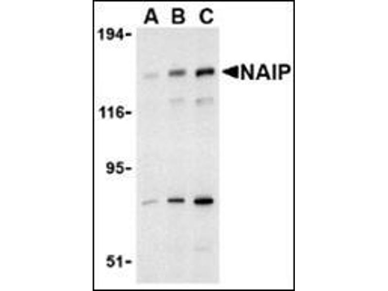 Neuronal apoptosis inhibitor protein (NAIP) was the first human inhibitor of apoptosis protein (IAP) identified and was discovered by its association with the neurodegenerative disorder spinal muscular atrophy (1,2). Members of the IAP family contain one to three copies of an approximately 70 amino acid motif termed baculovirus IAP repeat (BIR), these BIRs promote protein-protein interactions with various caspases such as caspase-3, -7, and -9 as well as members of the TRAF family of signal molecules (reviewed in 3). Unlike other IAPs however, NAIP requires ATP to bind caspase-9 and is not inhibited by the IAP-inhibiting molecule Smac/DIABLO (4), suggesting that NAIP is unique among the IAPs in its regulation of its activity. Finally, although only one human NAIP protein has been identified, other shorter NAIP mRNA transcripts have been reported (5).Synonyms: BIRC1, Baculoviral IAP repeat-containing protein 1