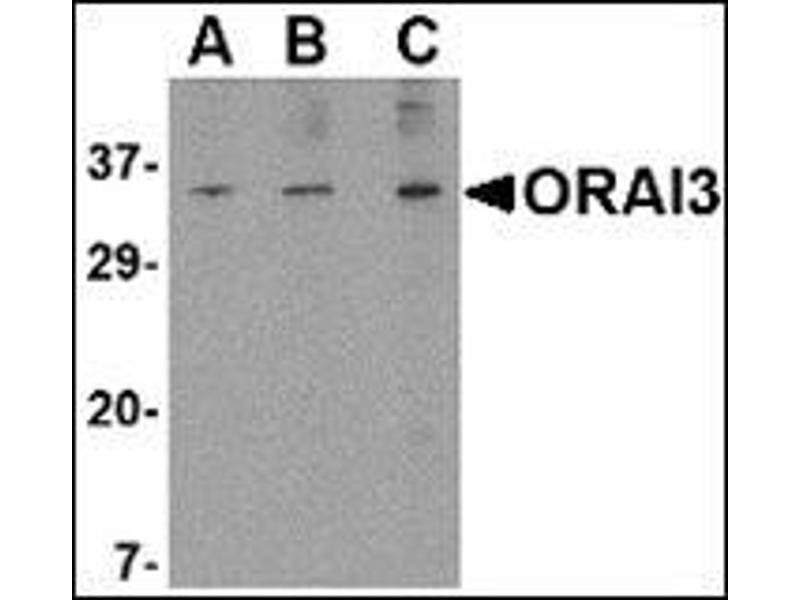 Antigen stimulation of immune cells triggers Ca++ entry through Ca++ release-activated Ca++ (CRAC) channels. ORAI3 is one of two mammalian homologs to ORAI1, a recently identified four-transmembrane spanning protein that is an essential component of CRAC. All three homologs have been shown to function as Ca++ plasma membrane channels gated through interactions with STIM1, the store-activated endoplasmic reticulum Ca++ sensor. However, ORAI3 channels failed to produce detectable Ca++ selective currents in cells co-transfected with ORAI3 and STIM1, indicating that ORAI3 channels undergo a lesser degree of depotentiation than ORAI1 or ORAI2. Na+ currents through ORAI1, 2 and 3 channels were equally inhibited by extracellular Ca++, indicating that each have similar affinities for Ca++ within the selectivity filter.Synonyms: ORAI-3, TMEM142C, Transmembrane Protein 142C
