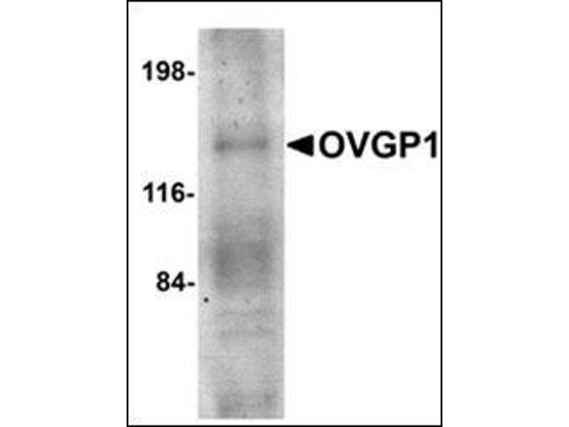 Oviductins belong to a family of glycoproteins that have been suggested to play several roles during the early processes of reproduction. OVGP1 is a large carbohydrate-rich, epithelial glycoprotein with numerous O-glycosylation sites within threonine, serine, and proline-rich tandem repeats. The protein is secreted from non-ciliated oviductal epithelial cells and associates with ovulated oocytes, blastomeres, and spermatozoan acrosomal regions. Despite its predicted molecular weight, OVGP1 will often run at higher molecular weight in SDS-PAGE. At least two isoforms of OVGP are known to exist.Synonyms: Estrogen-dependent oviduct protein, MUC9, OGP, OVGP1, Oviductal glycoprotein, Oviductin