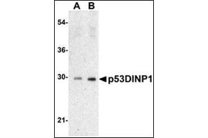 Apoptosis is related to many diseases and development. The p53 tumor-suppressor protein induces apoptosis through transcriptional activation of several genes. A novel p53 inducible gene was identified recently and designated p53DINP1 (for p53-dependent damage-inducible nuclear protein 1) and SIP (for stress induced protein) in human and mouse (1,2).?A p53DINP1 antisense oligonucleotide inhibits and overexpression of p53DINP1 enhances Ser46 phosphorylation of p53, induction of p53AIP1, and cell death induced by DNA double-strand breaks (1). p53DINP1 may regulate p53-dependent apoptosis through phosphorylation at Ser46 and induction of p53AIP1. The p53DINP1/SIP gene encodes two proteins of 27 and 18 kDa in human and mouse termed p53DINP1-a and p53DINP1-b or SIP27 and SIP18 (1,2). p53DINP1/SIP is expressed in many tissues and induced by a variety of stress agents including UV stress, mutagenic stress, heat shock, and oxidative stress (2).Synonyms: P53DINP1, SIP, Stress-induced protein, Tumor protein p53-inducible nuclear protein 1, p53-dependent damage-inducible nuclear protein 1, p53-inducible nuclear protein 1