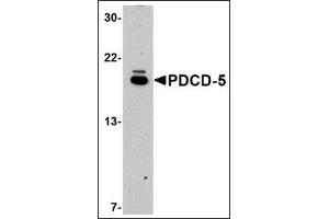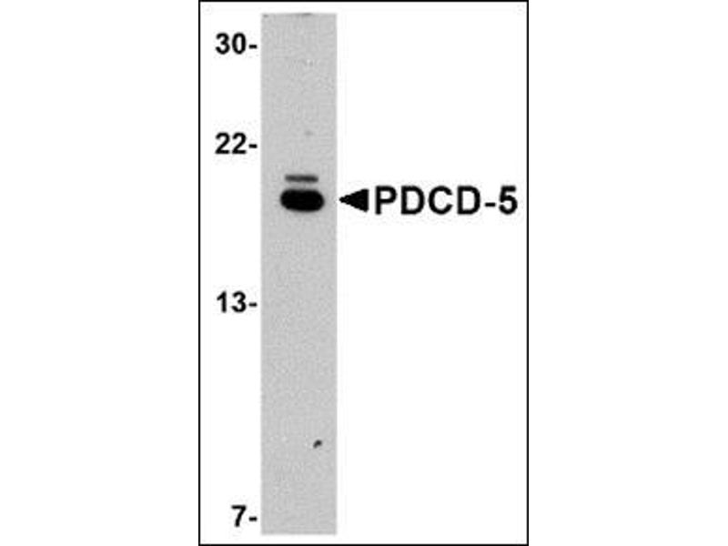Programmed cell death 5 (PDCD5), a human apoptosis-related protein, is thought to play an early and universal role in apoptosis. PDCD5 is widely expressed and is upregulated in cells undergoing apoptosis, where it translocates rapidly from the cytoplasm to the nucleus. PDCD5 has a compact core structure of low flexibility with two mobile alpha-helices at N-terminal and a flexible unstructured C-terminal region. The charged residues are crucial for the ability of apoptosis-promoting and cell translocation of the protein. PDCD5 can facilitate apoptosis and enhance TAJ/TROY-induced paraptosis-like cell death. PDCD5 may play a dual role in the Tip60 pathway. It interacts with Tip60 and functions as a Tip60 co-activator to promote apoptosis. The nucleotide polymorphisms in the 5?-upstream region of PDCD5 affect promoter activity and the susceptibility of a Chinese population to develop chronic myelogenous leukemia and may represent a novel tumor suppressor gene influencing lung cancer.Synonyms: Programmed cell death protein 5, TF-1 cell apoptosis-related protein 19, TFAR19