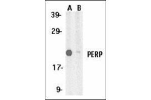 PERP antibody was raised against a synthetic peptide corresponding to amino acids near the carboxy terminus of human PERP, which differ from the mouse sequence by three amino acids (7-9).