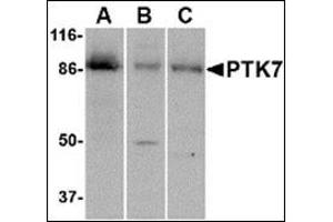 Protein-tyrosine kinases (PTKs) play important roles in regulating cell proliferation and differentiation during development. One member of the PTK family, PTK7, has been suggested to regulate the planar cell polarity (PCP) pathway in vertebrates and may play a role in neural convergent extension and neural tube closure. PTK7 has also been implicated in the development of cancer. Loss of PTK7 expression was seen in several melanoma cell lines and biopsies. Conversely, high-throughput analysis of acute myeloid leukemia samples showed an increased level of PTK7 expression compared to normal bone marrow and purified CD34+ cells. Multiple isoforms of PTK7 are known to exist.Synonyms: CCK-4, Colon carcinoma kinase 4, Tyrosine-protein kinase-like 7