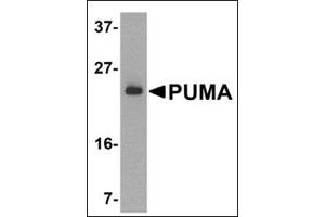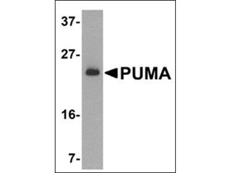 Apoptosis is related to many diseases and development. The p53 tumor-suppressor protein induces apoptosis through transcriptional activation of several genes. A novel p53 inducible pro-apoptotic gene was identified recently and designated PUMA (for p53 upregulated modulator of apoptosis) and bbc3 (for Bcl-2 binding component 3) in human and mouse (1-3). PUMA/bbc3 is one of the pro-apoptotic Bcl-2 family members including Bax and Noxa, which are also transcriptional targets of p53. The PUMA gene encodes two BH3 domain-containing proteins termed PUMA-alpha and PUMA-beta (1). PUMA proteins bind Bcl-2, localize to the mitochondria, and induce cytochrome c release and apoptosis in response to p53. PUMA may be a direct mediator of p53-induced apoptosis.Synonyms: BBC3, Bcl-2-binding component 3, JFY-1, p53 up-regulated modulator of apoptosis