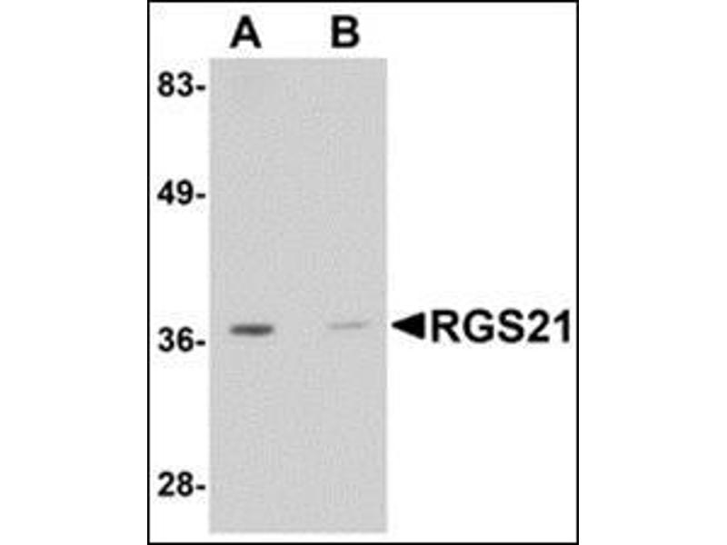 Regulator of G-protein signaling (RGS) proteins contain an 120 amino acid conserved domain, termed the RGS domain, that acts as a GTPase-activating protein that acts to reduce the signal transmitted by the receptor-activated G-alpha subunit. RGS21 is a recently identified member of this family that has been reported to be selectively expressed in subpopulations of taste bud cells and co-expressed with bitter and sweet transduction components such as alpha-gusticin, phospholipase Cbeta2, T1R2/T1R3 sweet taste receptors and T2R bitter taste receptors. Other reports indicate that RGS21 is more widely expressed. Binding assays demonstrate that RGS21 binds alpha-gusticin in a conformation-dependent manner and may do the same with T1R receptors, suggesting that RGS21 may play a role in sweet and bitter taste transduction processes.Synonyms: Regulator of G-protein signaling 21