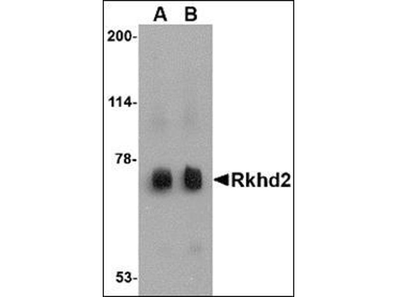 Rkhd2, also known as MEX3C is a member of a novel family of four homologous human MEX3 proteins each containing two heterogeneous nuclear ribonucleoprotein K homology (KH) domains and one carboxy-terminal RING finger module. MEX3 proteins, including Rkhd2, are phosphoproteins that bind RNA through their KH domains and shuttle between the nucleus and the cytoplasm via the CRM1 export pathway. These proteins are a novel family of evolutionarily conserved RNA-binding proteins, differentially recruited to P bodies and potentially involved in post-transcriptional regulatory mechanisms. It has been suggested that genetic variations in Rkhd2 may be associated with susceptibility to essential hypertension type 8. Rkhd3 and Rkhd4, but not Rkhd2, co-localize with both the hDcp1a decapping factor and Argonaute (Ago) proteins in processing bodies (P bodies), recently characterized as centers of mRNA turnover.Synonyms: RING finger and KH domain-containing protein 2, RING finger protein 194, RNA-binding protein MEX3C, RNF194