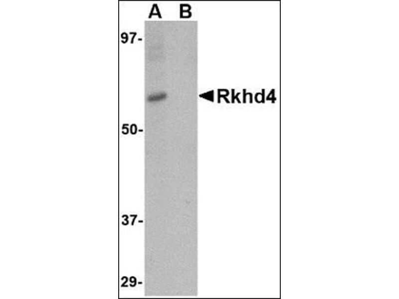 Rkhd4, also known as MEX3A is a member of a novel family of four homologous human MEX3 proteins each containing two heterogeneous nuclear ribonucleoprotein K homology (KH) domains and one carboxy-terminal RING finger module. MEX3 proteins, including Rkhd4, are phosphoproteins that bind RNA through their KH domains and shuttle between the nucleus and the cytoplasm via the CRM1 export pathway. These proteins are a novel family of evolutionarily conserved RNA-binding proteins, differentially recruited to P bodies and potentially involved in post-transcriptional regulatory mechanisms. While Rkhd2 has been suggested to be associated with susceptibility to essential hypertension type 8, the function of Rkhd4 remains unknown. Rkhd3 and Rkhd4, but not Rkhd2, co-localize with both the hDcp1a decapping factor and Argonaute (Ago) proteins in processing bodies (P bodies), recently characterized as centers of mRNA turnover.Synonyms: RING finger and KH domain-containing protein 4, RNA-binding protein MEX3A