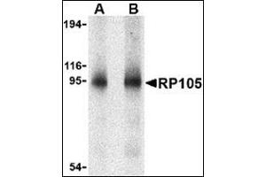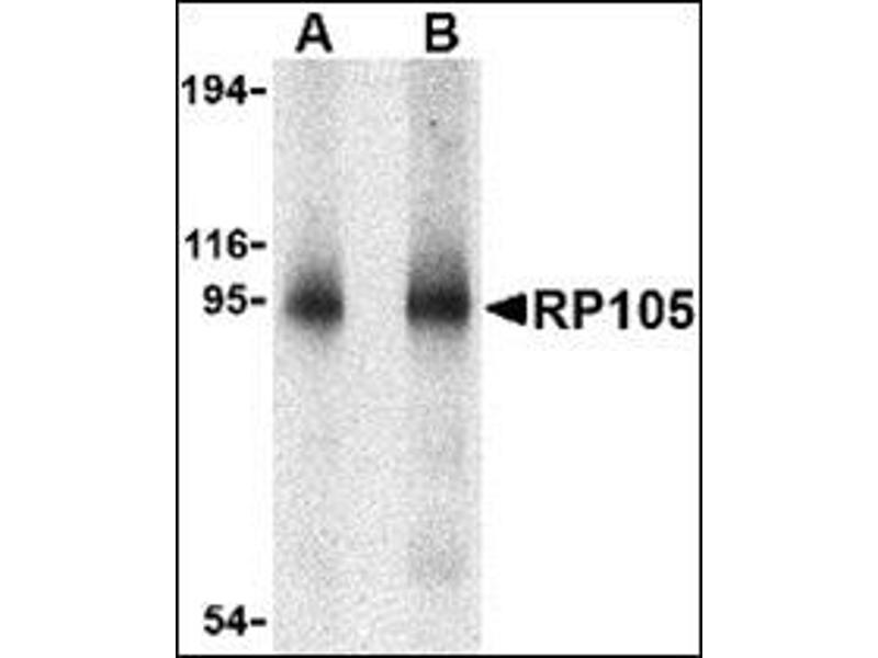 Toll-like receptors (TLRs) are evolutionarily conserved pattern-recognition molecules resembling the toll proteins that mediate antimicrobial responses in Drosophila. These proteins recognize different microbial products during infection and serve as an important link between the innate and adaptive immune responses. The signaling of these TLRs is kept under tight control by the expression of endogenous inhibiting proteins. One such protein is RP105, a recently identified homolog to TLR4 that, with MD-1, interacts with and inhibits the TLR4/MD-2 signaling pathway. It has also been suggested that the RP105/MD-1 complex influences antibody production mediated by both TLR4/MD-2 and TLR2 receptor complexes. Despite its predicted molecular weight, RP105 often migrates at 95 - 105 kDa.Synonyms: LY64, Lymphocyte antigen 64, Radioprotective 105 kDa protein