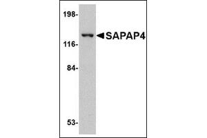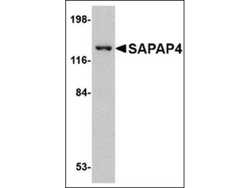 SAP90/PSD-95-associated protein 4 (SAPAP4, also known as DLGAP4) is a member of a protein family whose members specifically interact with PSD-95/SAP90, a membrane-associated guanylate kinase localized at postsynaptic density (PSD) in neuronal cells. Like the other SAPAP proteins, SAPAP4 is thought to be an adaptor protein that also interacts with different synaptic scaffolding proteins, cytoskeletal and signaling components, such as focal adhesion kinase (FAK) and proline-rich tyrosine kinase 2 (PYK2). SAPAP4 mRNA is targeted to cell bodies in a similar manner to SAPAP1 and -2, whereas SAPAP3 mRNA is detected mainly in cell bodies. At least three isoforms of SAPAP2 are known to exist.Synonyms: DAP-4, DAP4, Disks large-associated protein 4, KIAA0964, PSD-95/SAP90-binding protein 4, SAP90/PSD-95-associated protein 4