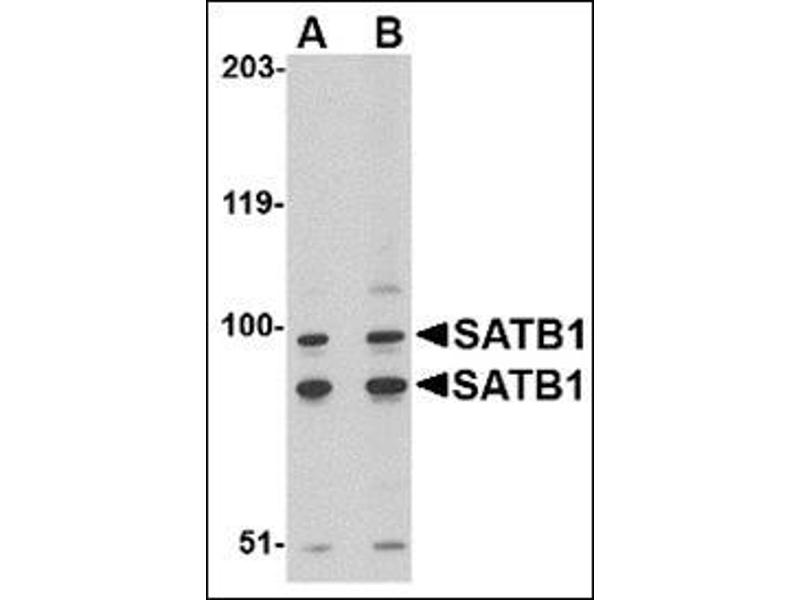Human special AT-rich sequence-binding protein-1 (SATB1) is a nuclear matrix/scaffold-associated region DNA-binding protein, predominantly expressed in the thymus and pre-B cells. Like its homolog SATB2, SATB1 selectively binds double-stranded, special AT-rich DNA sequences in which one strand exclusively consists of well-mixed A, T, and C nucleotides. SATB1 contains a dimerization domain that shares similarity with the PDZ motif, identified as an indispensable element for high-affinity binding of SATB1 to DNA. SATB1 constitutes a functional nuclear architecture that has a \'cage-like\' protein distribution surrounding heterochromatin and regulates gene expression through chromatin remodeling/HDAC (histone deacetylase complex) and transcription factors recruitment. SATB1 functions as a \'genome organizer\' essential for proper T-cell development. Recent studies show that SATB1 is necessary for breast cancer cells to become metastatic, and when ectopically expressed in non-metastatic cells, can induce invasive activity in vivo. At least two isoforms of SATB1 are known to exist.Synonyms: DNA-binding protein SATB1, Special AT-rich sequence-binding protein 1