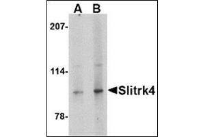 SLIT and NTRK-like family 4 (Slitrk4) is a member a protein family consisting of six homologous transmembrane proteins (Slitrk1-6) that share two conserved leucine-rich repeat domains in the extracellular domain and have significant homology to Slit, a secreted axonal growth-controlling protein. These proteins are also homologous to trk neurotrophin receptors in their intracellular domains. Expression of Slitrk proteins is highly restricted to neural and brain tumor tissues, but varies within the protein family. Like every other Slitrk protein except Slitrk1, overexpression of Slitrk4 inhibited neurite outgrowth in cultured neurons, suggesting that these proteins are involved in the control of neurite outgrowth.Synonyms: SLIT and NTRK-like protein 4