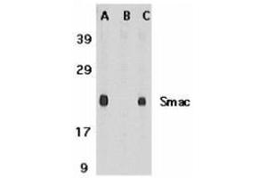 The inhibitor of apoptosis proteins (IAPs) regulate programmed cell death by inhibiting members of the caspase family of enzymes. A novel mammalian protein that binds to IAPs and neutralizes the inhibitory effect of IAPs on caspases was recently identified and designated Smac/DIABLO (1,2). Smac/DIABLO is a mitochondrial protein that is released along with cytochrome c during apoptosis and activates cytochrome c/Apaf-1/capase-9 pathway. Analysis of the structural basis of Smac/DIABLO reveals that the N-terminal amino acids are required for binding of Smac/DIABLO to IAPs and activation of caspases (3-6). Smac/DIABLO is expressed in a variety of human and mouse tissues (1,2).Synonyms: Diablo homolog mitochondrial, Direct IAP-binding protein with low pI, Second mitochondria-derived activator of caspase