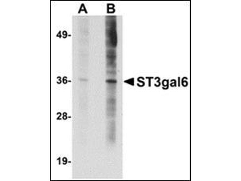 Sialyltransferases catalyze the transfer of sialic acid from cytidine 5-prime monophospho-N-acetylneuraminic acid (CMP-NeuAc) to terminal positions of glycoprotein and glycolipid carbohydrate groups. Terminal NeuAc residues are key determinants of carbohydrate structures, such as the sialyl-Lewis X determinants, and are widely distributed in many cell types. However, cancer cells often express more heavily sialylated glycans on their cell surface and this feature sometimes correlates with invasiveness. In contrast, expression of ST3gal6, a member of the sialyltransferase family that sialylates type II lactosamine structures on glycoproteins and glycolipids, was found to be significantly decreased by hypermethylation of the gene in gastrointestinal cancer. At least three isoforms of ST3gal6 are known to exist.Synonyms: 3-sialyltransferase, 3-sialyltransferase VI, CMP-NeuAc:beta-galactoside alpha-2, SIAT10, ST3Gal VI, ST3GalVI, Sialyltransferase 10, Type 2 lactosamine alpha-2