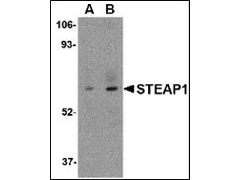 The six-transmembrane epithelial antigen of prostate 1 (STEAP1) was the first member of a family of metalloreductases identified as cell-surface antigens in prostate tissue. The normal function of STEAP is still uncertain, unlike other members of the STEAP family, STEAP1 does not promote iron or copper reduction or uptake and lacks the FNO-like reductase domain critical for activity. However, its expression is highly increased in multiple cancer cell lines, including prostate, bladder, colon, and ovarian cancers. Supporting this is evidence that STEAP1 peptides can be used to stimulate CD8+ T cells from healthy donors, enabling them to recognize STEAP1-positive human tumor cells, suggesting that STEAP1 may a potential target for cancer immunotherapy. At least three isoforms of STEAP1 are known to exist.Synonyms: Metalloreductase STEAP1, PRSS24, STEAP-1, Six-transmembrane epithelial antigen of prostate 1