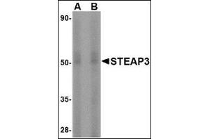 The six-transmembrane epithelial antigen of prostate 3 (STEAP3) is a member of a family of metalloreductases identified as cell-surface antigens in prostate tissue. Similar to two other members of the STEAP family (STEAP 2 and STEAP4), STEAP3 promotes both iron and copper reduction. STEAP3 is highly expressed in hematopoietic tissues and colocalizes with the transferrin endosome. Overexpression of STEAP3 stimulates iron reduction, mice lacking STEAP3 are deficient in erythroid ferrireductase activity, suggesting that STEAP3 is an endosomal ferrireductase required for transferrin-dependent iron uptake in erythroid cells.Synonyms: Dudulin-2, Metalloreductase STEAP3, STEAP-3, Six-transmembrane epithelial antigen of prostate 3, Tumor suppressor-activated pathway protein 6, pH yde
