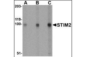 In T lymphocytes, the sole pathway for Ca++ entry following antigen-receptor binding is through store-operated Ca++-release-activated Ca++ (CRAC) channels. These channels are made up of the pore-forming subunit ORAI1 and the stromal interaction molecule 1 (STIM1), a protein that functions as a Ca++ sensor and activates the CRAC channels, migrating to the plasma membrane from endoplasmic reticulum (ER)-like sites which act as the Ca++ store. A related molecule, STIM2, acts to inhibit the STIM1-mediated store-operated Ca++ entry, and can form complexes with STIM1, suggesting they may play a coordinated role in controlling Ca++ entry. At least three isoforms of STIM2 are known to exist. This STIM2 antibody is predicted to have no cross-reactivity to STIM1.Synonyms: KIAA1482, Stromal interaction molecule 2
